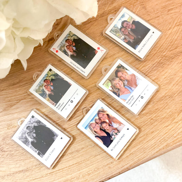 Each polaroid beautifully mimics the iconic Polaroid frame, featuring a cherished photo of your choice, paired with a heartfelt message or song title for that extra personal touch. Crafted from high-quality acrylic, these baubles are lightweight yet durable, making them ideal for hanging in your car, on your keys, or as charming decorations around your home.