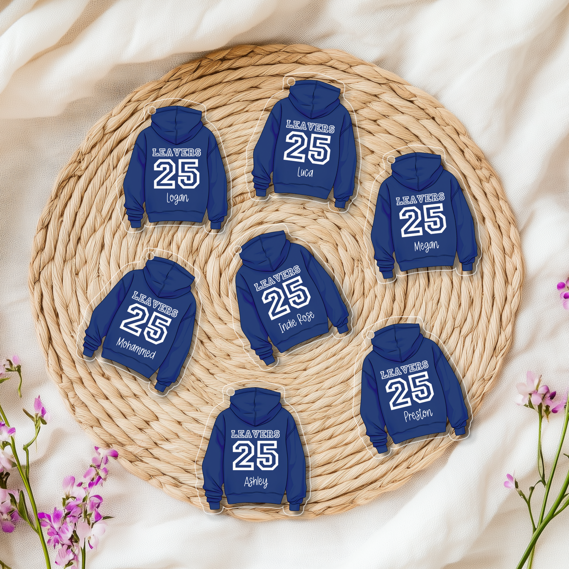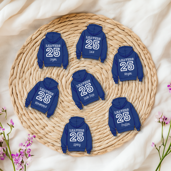 Celebrate the memories of your school years with our Personalised School Leavers Acrylic Keyrings! These stylish and durable keepsakes feature a mini hoodie design, complete with your chosen name and graduation year, making them the perfect memento for students, classmates, and teachers.